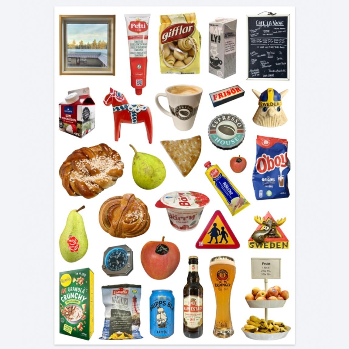 スウェーデンならではの木彫りの人形やその地方のヨーグルト、グラノーラなど.